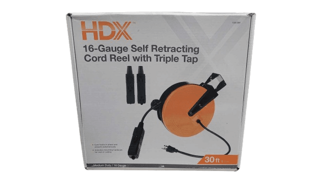 The HDX retractable cord reel has a 30 ft. 16/3 SJT cord. With 3 separate grounded outlets and a 10 Amp rating, powering your projects is quick and easy. Simply pull out what you need and when you’re done, all the cord winds back up inside the heavy-duty metal housing.