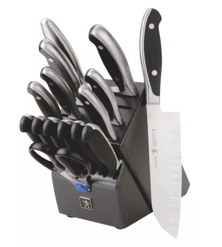 Includes: Paring Knife, Peeler, Knife Sharpener, Bread Knife, Steak Knife, Utility Knife, Chef Knife, Carving Knife, Shears, Knife Block, Santoku Knife