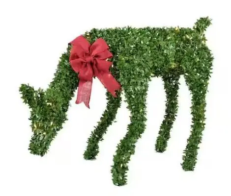 Adorn your front lawn this coming holiday season with this Faux Boxwood Topiary Feeding Doe. It is garnered with 125 warm, white LED lights that allow the Feeding Doe to glow at night for a dazzling display. Fitted with a quality burlap bow and ribbon, this Feeding Doe will be seen from your yard from miles away and offers the perfect focal point during the holidays.