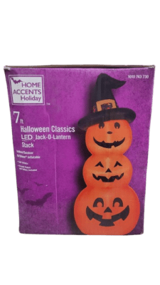 The Home Depot Home Accents Holiday 7 ft. Jack-O-Lantern Stack AirBlown inflatable is the perfect Halloween decoration. Triple your Halloween fun with this happy stack of Jack-O-Lanterns featuring 3 pumpkins in graduated sizes and smiling faces. To top it off, a black witch hat is placed on the stack to complete the spooky look. This Jack-O-Lantern trio inflatable is perfect for indoors or outdoors. Pair two stacks at the entry way of a home or driveway to create an eye-catching entrance. The self-inflating design with stakes and tethers included allows effortless setup. Activate the integrated LED lights by plugging the power cord into the nearest outlet to ensure safe and hassle-free operation.