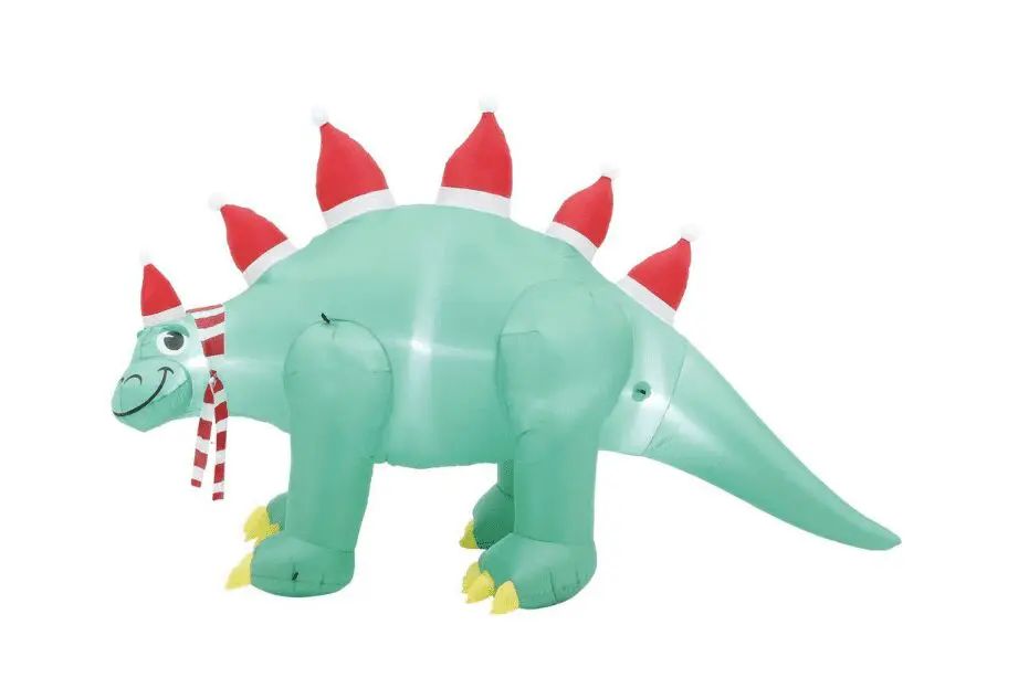 Create an outdoor holiday wonderland with this adorable stegosaurus. Wearing a jaunty Santa hat, he will bring a smile to guests and passerby. Setup is easy for this Christmas decor; it self-inflates in seconds and includes a blower for easy setup. Use it as a whimsical standalone decoration or combine it with other inflatables to create a custom scene. This weather-resistant decoration is rated for indoor or outdoor use.