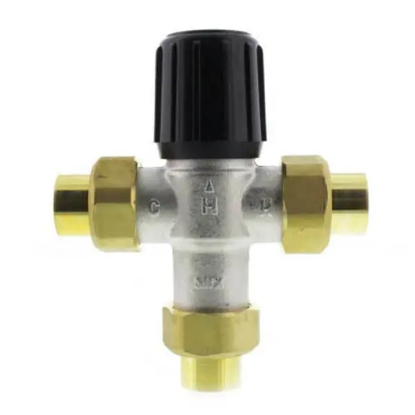 Honeywell AM-1 Thermostatic Mixing Valve, Accurate, Dual Purpose, 1/2 Inch, Union Sweat, 8 gpm, 150 psi, 3.9 Cv, Nickel Plated Brass, 4.42 Inch H x 4.72 Inch W, Includes: Check Valves