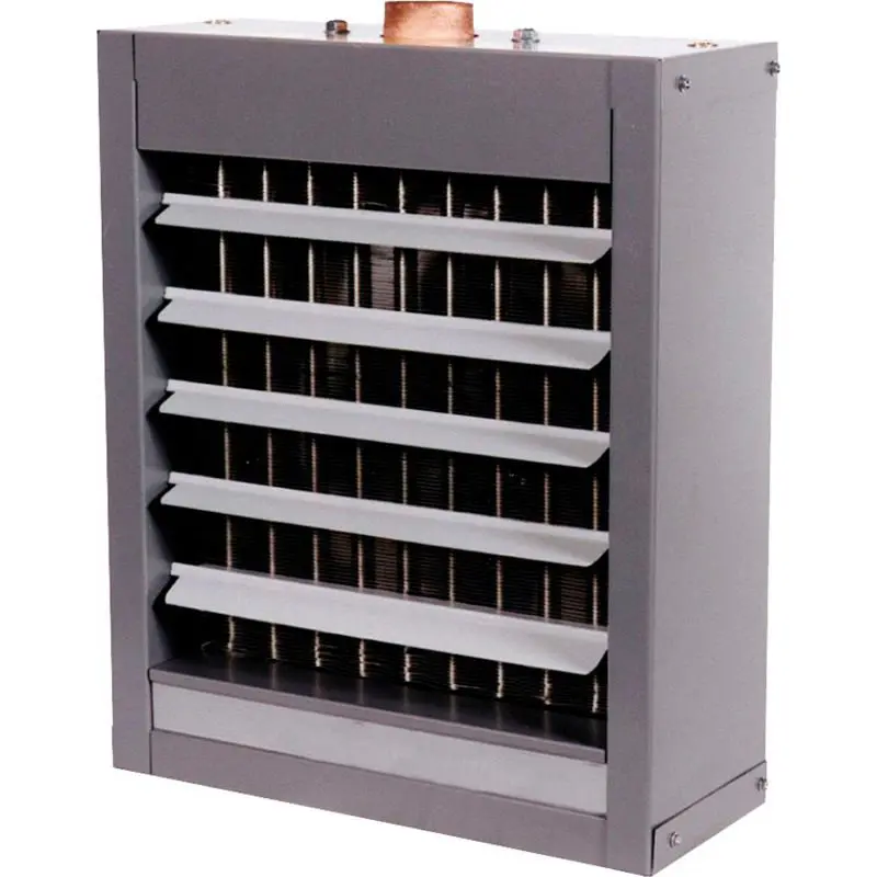 Header type coil style, 24,000 BTU horizontal hydronic unit heater, OSHA fan guard standard, approved for residential/commercial water/steam applications, 20 gauge steel casing, seamless copper tubing coil with aluminum fin design, coil brazed into extruded header junctions, ETL certified at 200° EWT and 2 psi steam.