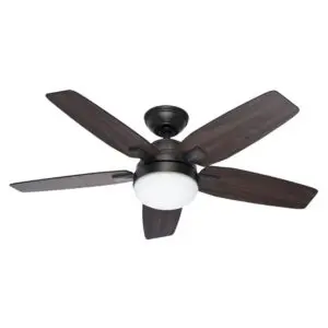 The 46 in. Noble Bronze Antero ceiling fan from Hunter exhibits rich and contemporary styling that will blend seamlessly into your decor. This modern fan includes 5 reversible distressed walnut/cherry blades. The Antero also includes an integrated light fixture with two 14-Watt CFL bulbs. This fan is perfect for small rooms and is designed to install easily with 3 different mounting options. The WhisperWind motor delivers ultra-powerful air movement with whisper-quiet performance so you get the cooling power you want without the noise you don’t.