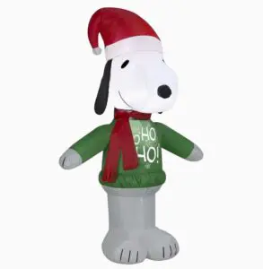Home Accents Holiday 42 in. Air blown Inflatable Snoopy is dressed in a Ho Ho Ho sweater, Santa Hat and scarf and welcomes your holiday guests. Internal LED lights delivers a beautiful night time display. Simply stake it down and watch it inflate in seconds.
