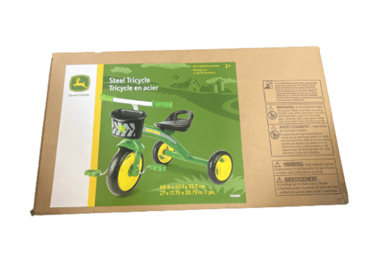 Driveways and sidewalks are ready to be explored on this John Deere Steel Tricycle. Featuring all new treads design graphics, kids will love having this as their first John Deere to ride around on. The heavy duty construction will stand up to the way kids really ride. This tricycle has a roomy front basket for all those treasures they find on the way or to give that favorite stuffed friend a ride.
