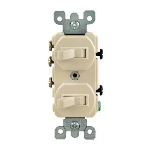 This ivory Leviton 15 Amp 3-Way Duplex Toggle Switch is a single-pole toggle switch and a 3-way toggle switch. The space-saving design fits multiple devices in a single, standard wall box. The 3-way switch is for creating a 3-way circuit with another 3-way switch (sold separately) to control lighting from 2 locations.