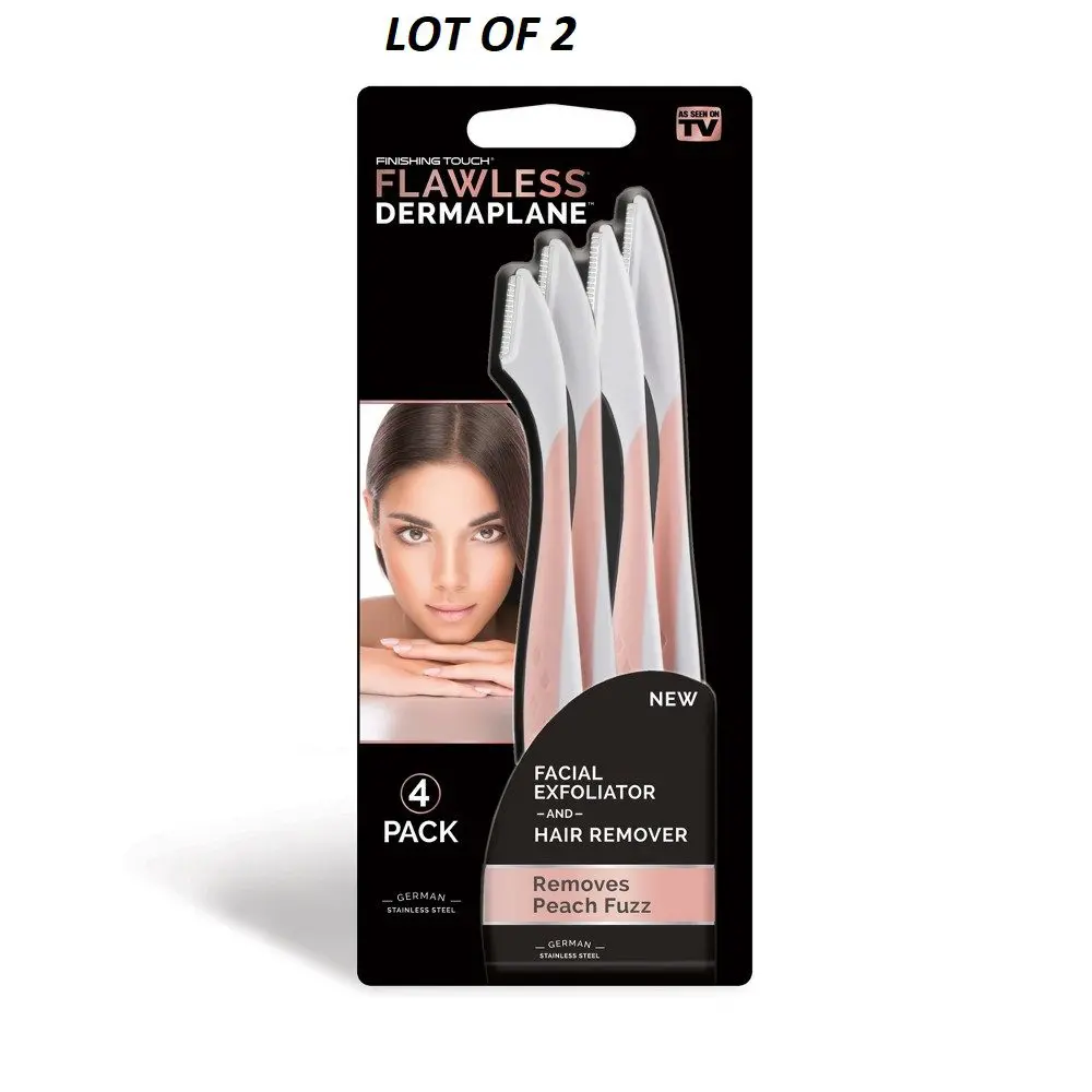 Flawless by Finishing Touch Flawless DermaPlane Facial Exfoliator and Hair Remover exfoliates and removes facial hair to help improve the surface of the skin and enable flawless application of makeup and topical creams. Each package contains 4 Flawless DermaPlanes – 2 long for large areas, and 2 short for small areas that require more precision. Flawless DermaPlanes are made with German stainless steel blades that boast a ridged safety-guard designed to protect your skin, and soft-grip handles for precision control. Each Flawless DermaPlane includes safety covers that protect the blades. Dermaplaning is a highly effective facial exfoliation procedure designed to trigger the cell regeneration process. Dermaplaning helps rid the face of excess fine hairs (peach fuzz) which can trap dirt and oil, and give skin a dull look. After dermaplaning, let your skin rest, no creams or make up, for several hours afterward. The common benefits of dermaplaning include better penetration of skin care products, smoother makeu