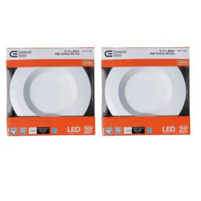 This Commercial Electric 5 in. & 6 in. White Integrated LED High Lumen Recessed Trim is designed to reduce the need to change light bulbs, save money, and upgrade the look of your ceiling. This item produces over 1,400 Lumens (about the same as a 100 watt bulb) to provide more light from higher ceilings. Because the LED light source is built into the light fixture and made to last for over 20 years, you don’t have to get back on that ladder to replace light bulbs ever again. These recessed ceiling lights use 75% less electricity to produce the same amount of light as incandescent light bulbs. They are airtight rated to prevent losses of air conditioning and heat, saving you even more. Whichever rooms you choose to update, these recessed lights will make your ceiling look great with the modern, stylish look of a solid, recessed light lens and sleek white trim ring. These Integrated LED lights are wet location rated for use in kitchens and bathrooms or outdoors. They install in minutes with no tools and no wiring. These recessed ceiling lights can be used in ceilings with or without insulation, and they are compatible with most LED rated dimmers (see instructions). These lights are Energy Star listed and backed by a 5 year warranty. Stop wasting money and time with light bulbs and start saving with Commercial Electric LED, only available at The Home Depot.