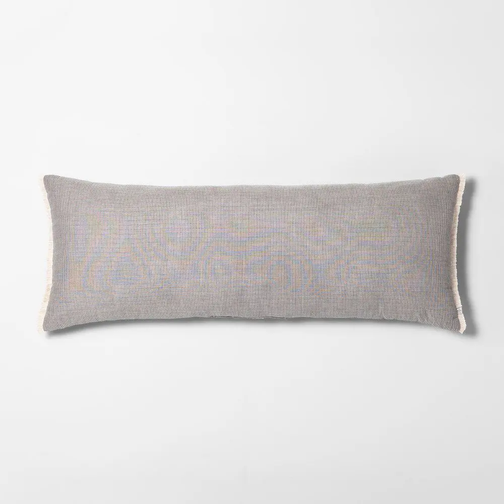 Spruce up your indoor space with this stunning Oversize Microstripe Double-Weave Lumbar Throw Pillow from Hearth & Hand™ with Magnolia. Crafted in soft, breathable cotton with a plush filling and a slim construction, this lumbar pillow fits perfectly into the small of your back, offering optimum support while you relax. Fashioned with thin, cream stripes, a double-weave construction and fringe accents along the shorter sides, this throw pillow makes the perfect addition to any space. Place on its own or as a set of bolster pillows to create a cozy space.