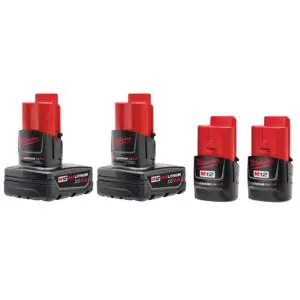 This MILWAUKEE Combo Kit includes two M12 REDLITHIUM XC4.0 Battery Packs and two M12 REDLITHIUM CP2.0 Compact Batteries. The M12 extended capacity batteries deliver 4 Ah of run time even in sub-zero temperatures. Milwaukee’s revolutionary cell monitoring and temperature regulation prolong the life of M12 batteries, meaning fewer work interruptions and more recharges than ever. The M12 REDLITHIUM XC4.0 batteries provide up to 2X more run-time, 20% more power and 2X more recharges. The compact battery packs are durably built for heavy-duty use, run cooler and perform in climates below 0°F/minus 18°C, integrated temperature management systems help maximize the batteries’ lives. The compact battery has a lightweight design that allows users to work in tight spaces and reduce fatigue. M12 batteries feature REDLINK Intelligence engineered to prevent overloads and protect against cell-damaging discharge. Milwaukee M12 batteries have superior pack construction, electronics and performance providing users with more work per charge and more work over pack life than any batteries on the market.