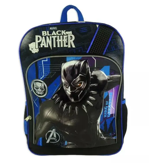 Black Panther large backpack. Features one main compartment and a front accessory pocket with zipper closures. A laptop sleeve, ID window and reflective strips on padded adjustable straps. This backpack also has air mesh side pockets and a top lockerloop handle.