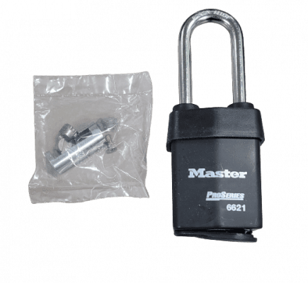 The Master Lock Number 6621 Pro-series Weather Tough Covered Laminated Padlock features a 2-1/8 in. (54 mm) heavy-steel body to withstand physical attack and a 1-1/8 in. (29 mm) Tall, 5/16 in. (8 mm) Dia hardened boron alloy shackle for superior cut resistance. Padlock is available with our without cylinder to key at your facility with a choice of 22 Key- in-Knob keyways to match this padlock to your security door locks. The exclusive cover protects from water, ice, dirt and grime.
