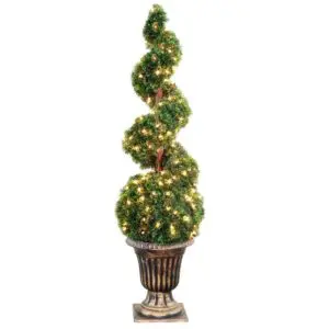 The unique shape of this Cedar Spiral tree makes it an interesting and attractive topiary decoration. This artificial planting in decorative urn base, looks and feels real yet requires none of the maintenance required of a living plant. It is pre-lit with 150 UL listed clear lights that remain lit even if a bulb burns out. Perfect for display inside or outside the home.