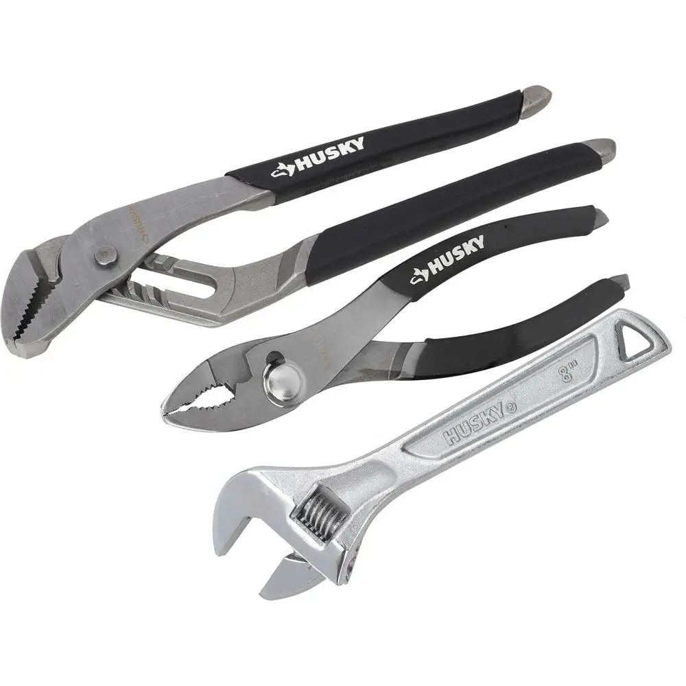 The 3-piece Pliers and Wrench includes one 10 in. Groove Joint Pliers, one 8 in. Slip Joint Pliers and one 8 in. Adjustable Wrench. Groove Joint Pliers also known as tongue and groove pliers are often used for gripping irregularly shaped objects. It can also be used for clamping materials. The Standard Slip Joint Pliers are used for turning or bending small objects. It is designed to allow the worker to apply force to the object being gripped. The 8 in. Adjustable Wrench is designed to be used with multiple sizes of nuts and bolts.
