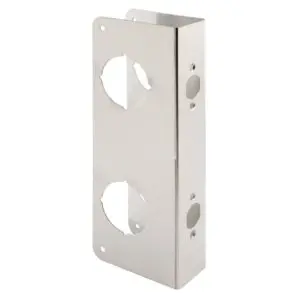 This is a solid brass door reinforcer in a stainless steel finish. This helps prevent a forced entry. Typically used on wood or metal doors that are 1-3/4 in. thick with mortise or drive-in latches. Accommodates key-in knob locksets or deadbolts, or combination locksets. It features two 2-1/8 in. bores with a 2-3/8 in. backset. Hole spacing is 5-1/2 in. on center. Dimensions are 3-7/8 in. wide and 10-7/8 in. tall.