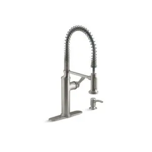 Inspired by the design of professional kitchens, the Sous pull out kitchen faucet will bring to life your inner chef. It includes assembled faucet, 29-1/2 in. supply lines, soap/lotion dispenser, and deck plate. Its high arch and unique exposed-spring design exceptional control and flexibility.