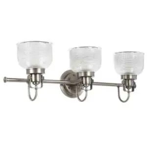 Desc: The authentic, prismatic style glass shade diffuses light to provide functional and stylish illumination. Finely crafted strap and knob details are conveyed by the Antique Nickel finish. This three-light fixture can be installed with the glass facing up or down to suit your preference.