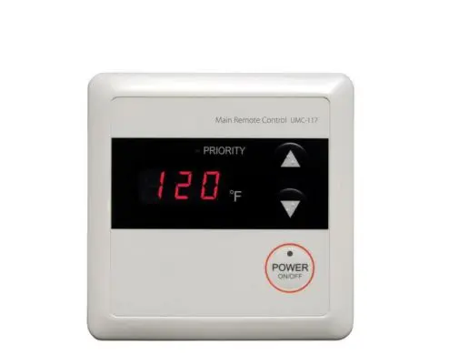 UMC-117 main remote-control pad. Allows for easy temperature adjustment and maintenance information access. Connect up to 3 remote controls to your tankless system.