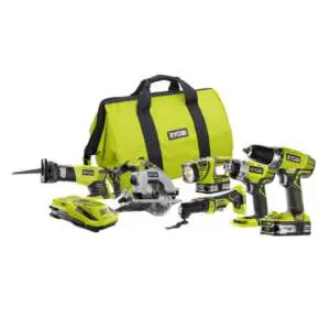 RYOBI introduces the 18-Volt ONE+ Lithium Ion Cordless 6-Tool Combo Kit with (2) 1.5 Ah LITHIUM+ Batteries, Charger, and Tool Bag. The variable speed reciprocating saw includes a blade with a 7/8 in. stroke length capable of 3,100 SPM. For high torque fastening jobs, turn to the impact driver for spinning lag bolts and deck screws. A carbide tipped blade comes with the 5-1/2 in. circular saw, capable of carving through material at speeds up to 4700 RPM (no load). A keyless chuck secures 1/2 in. bits into the drill, a tool that allows you to select one of 24 clutch settings for optimal torque. Cut, scrape, and sand hard-to-reach spaces with the JobPlus Base and Multi-Tool Adapter. With the ONE+ Worklight, you’ll never lose sight of your projects. This worklight can be positioned on its belly, rear, or hung from above. Best of all, it’s a part of the the RYOBI ONE+ World’s Largest 18-Volt Tool System*. Backed by the RYOBI 3-Year Manufacturer’s Warranty, this 6-Tool Combo Kit includes a Drill/Driver with Screwdriver Bit, a Circular Saw with Blade and Blade Wrench, a Reciprocating Saw with two Blades and a Hex Key, an Impact Driver with Phillips Bit and Socket Adaptor, a JobPlus Base with Multi-Tool Attachment Head, Wood Cutting Blade, Segment Saw Blade, Sanding Pad, Sample Sandpaper, an Allen Wrench, a Universal Multi-Tool Accessory Adaptor, a Worklight, a Charger, two 1.5 Ah LITHIUM+ Batteries, a Tool Bag, and operator’s manuals.