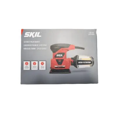 The Skil Sheet Palm Sander is the perfect tool for faster stock removal and smooth results when you’re putting the finishing touch on your project. The pressure control indicator lets you know when the right amount of pressure is applied and warns you when there’s too much. The pad brake eliminates gouging. Micro-filtration captures and contains fine dust particles to keep your work surface cleaner. A sealed switch keeps dust out of the tool for a long life. The dust canister is clear, removing the guess work of figuring out when to empty it.