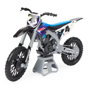 Feel the adrenaline with the all-new, official 1:10 scale die-cast Supercross motorcycles! These authentic racing replicas are highly detailed and look just like the powerful bikes the top pro riders use! Featuring realistic details and graphics, working rear suspension and metal die-cast motors, the 1:10 scale Supercross dirt bikes bring the action and excitement you’ve seen in live events into your home. Turn your living room into a Supercross stadium and race through obstacles, pulling off hairpin turns, whoops, high jumps and more to become Supercross Champion with your very own replica! Each 1:10 scale Supercross bike also includes a display stand, so you can show off your dirt bike in style. Collect all of the 1:10 scale Supercross motorcycles, including replicas of Justin Brayton, Ricky Carmichael, Justin Hill’s bikes and more (each sold separately)! Experience epic Supercross action right at home with the official 1:10 scale die-cast Supercross motorcycles!
