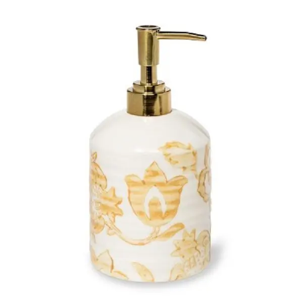 Bring rustic charm to your sink space with this Floral Ceramic Soap Dispenser from Threshold. This yellow soap dispenser features a ceramic construction, with yellow floral images covering the white background. A gold-finish pump adds a touch of elegance while delivering just the right amount of soap or lotion for your hands. Whether you’re going for a whimsical bathroom or you prefer a traditional vibe, this floral soap dispenser brings versatile, practical style.