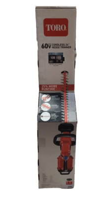 Spruce up your lawn care routine with the Toro 60V Max* Battery 24″ Hedge Trimmer. It can tackle big jobs in no time with a 24″ bar and 3/4″ cut capacity. Get a cleaner, more efficient trim with less vibration with the crisscrossing, scissor-like blades of the dual-action cutting system. The handy handle is comfortable and designed to reduce arm fatigue. Plus, rotate the handle with the push of a button for quick, easy, and comfortable vertical trimming. Cut the cord with run-time up to 75 minutes on a full charge.** Have peace of mind, as Toro stands behind its products with a full warranty, not just limited coverage. Toro 60V is the one-stop-shop for all-season performance. Universal battery powers all tools in the Flex-Force line, from mowers to string trimmers to snow blowers. Choose Toro with confidence to save time, eliminate hassles, and have a great-looking yard. Count on it. *Battery manufacturer rating = 60V maximum & 54V typical usage. Actual voltage varies with load. **Based on L135 battery, at low speed in controlled laboratory testing of product.