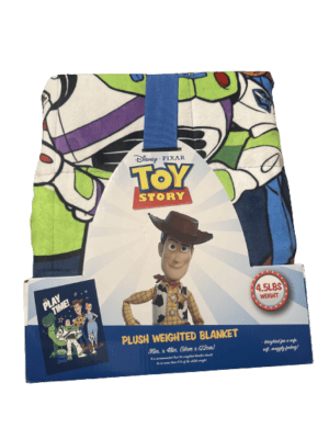 Its Play Time! Featuring Woody, Buzz, Rex, Bo Peep, Forky and a little green alien! The size of this weighted blanket is 36 inches by 48 inches and weighs 4.5 pounds. The blanket is filled with 82% glass beads and 18% polyester. This blanket is machine washable. Please do take appropriate precautions during use. It is recommended that the weighted blanket should be no more than 10% of the child’s weight.