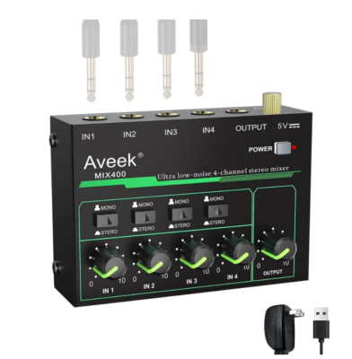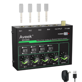 The Aveek 4-Channel Mini Stereo Audio Mixer delivers professional-grade audio control in a remarkably portable package. Engineered for the discerning musician or performer, its advanced low-noise circuitry ensures pristine signal integrity, making it ideal for precision sub-mixing of microphones, guitars, bass, and electronic instruments. The versatile connectivity, including 1/4″ TRS inputs and outputs with a stereo/mono switch, provides exceptional flexibility for both stage and studio applications. Housed in a durable, compact metal chassis, this mixer combines robust functionality with an intuitive layout of independent volume controls, guaranteeing clear, distortion-free sound blending and effortless operation for rehearsals, small gigs, and mobile production setups.